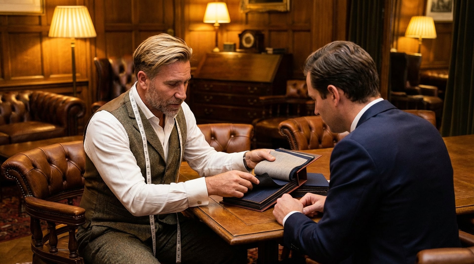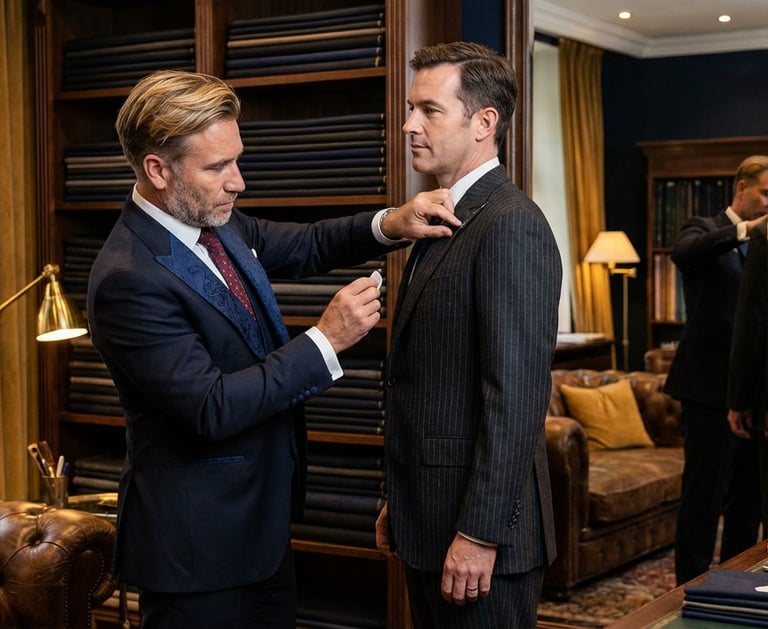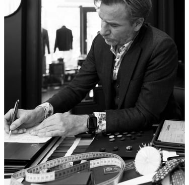 Formé par les meilleurs maîtres tailleurs et drapiers en Italie, en Angleterre et en France, il a développé un œil rare : celui qui voit immédiatement ce qu'un corps demande, ce qu'un style peut exprimer, ce qu'un tissu peut raconter.