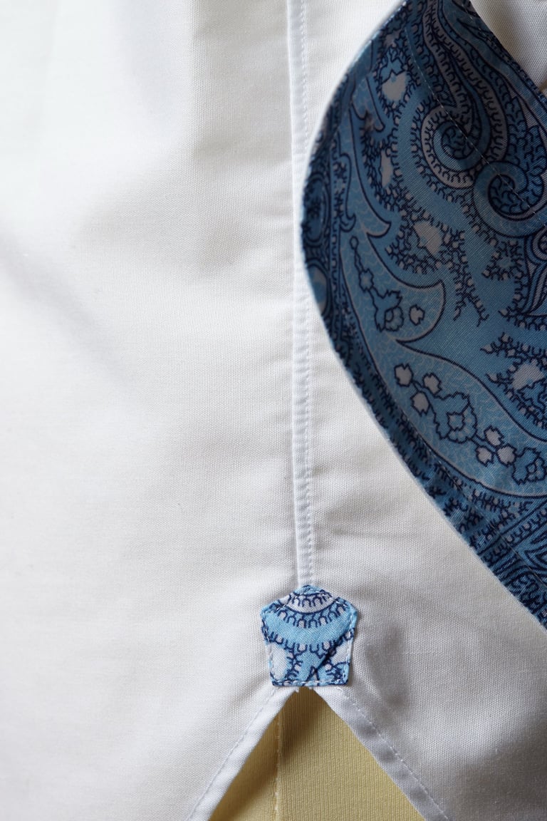 Mais toujours cette attention particulière au détail, avec des finitions de grande qualité : piqûre à 7 points au cm (gage de solidité), boutons en nacre montés en fleur de lys, boutonnière cousue “en goutte d’eau”, une hirondelle qui ferme le bas de la chemise, initiales brodées à la main, baleine amovible en nacre....